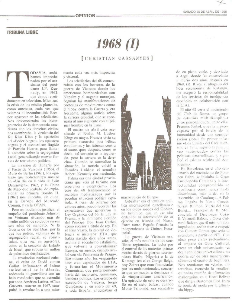1968 (1) 24 abril, 199830 abril, 2011 / xaviercassanyes EL MUNDO-BALEARES, 24-04-1998 Compartir Email a link to a friend (Se abre en una ventana nueva) Correo electrónico Compartir en WhatsApp (Se abre en una ventana nueva) WhatsApp TweetMás Compartir en Reddit (Se abre en una ventana nueva) Reddit Compartir en TumblrPocket Compartir en Telegram (Se abre en una ventana nueva) Telegram Me gusta Cargando... Relacionado