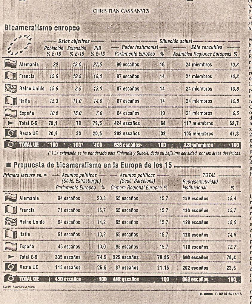 Este tipo de reformas institucionales podrían ser planteadas, a propósito de las indudables negociaciones que habrán de resolver el tema de los Fondos de Cohesión, la Agenda 2000. No es que sea de la opinión que hay que ir hacia un entreguismo en estos pero, teniendo conciencia de la argumentación de ambas partes, será preciso, llevar en la chistera, valores de intercambio, y ésa, la creación de la Cámara Regional Europea, implicaría redimensionar la importancia de España en Europa.