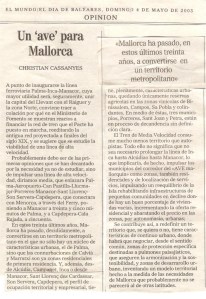 Un «ave» para Mallorca. 4 mayo, 200317 mayo, 2011 / xaviercassanyes EL MUNDO-BALEARES, 04-05-2003 Compartir Email a link to a friend (Se abre en una ventana nueva) Correo electrónico Compartir en WhatsApp (Se abre en una ventana nueva) WhatsApp TweetMás Compartir en Reddit (Se abre en una ventana nueva) Reddit Compartir en TumblrPocket Compartir en Telegram (Se abre en una ventana nueva) Telegram Me gusta Cargando... Relacionado