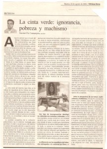 La cinta verde: ignorancia, pobreza y machismo. 24 agosto, 200417 mayo, 2011 / xaviercassanyes Última Hora, 24-08-2004 Compartir Email a link to a friend (Se abre en una ventana nueva) Correo electrónico Compartir en WhatsApp (Se abre en una ventana nueva) WhatsApp TweetMás Compartir en Reddit (Se abre en una ventana nueva) Reddit Compartir en TumblrPocket Compartir en Telegram (Se abre en una ventana nueva) Telegram Me gusta Cargando... Relacionado
