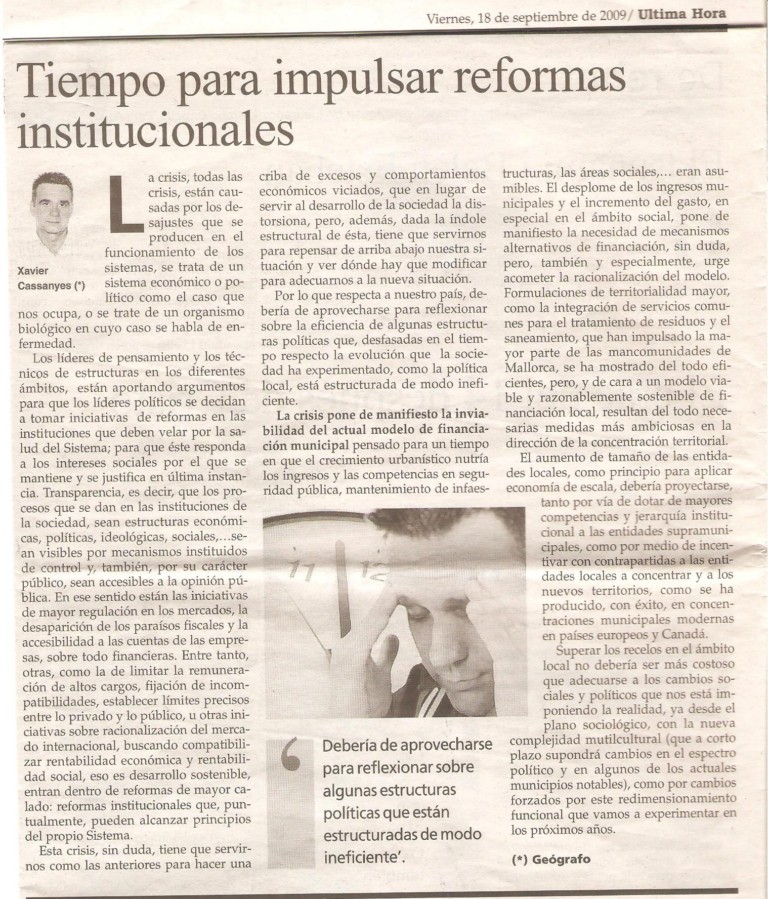 Tiempo para reformas institucionales. 18 septiembre, 20094 junio, 2011 / xaviercassanyes A propósito del artículo de ayer. Publicado en 2009. UH, 18-09-2009 Compartir Email a link to a friend (Se abre en una ventana nueva) Correo electrónico Compartir en WhatsApp (Se abre en una ventana nueva) WhatsApp TweetMás Compartir en Reddit (Se abre en una ventana nueva) Reddit Compartir en TumblrPocket Compartir en Telegram (Se abre en una ventana nueva) Telegram Me gusta Cargando... Relacionado