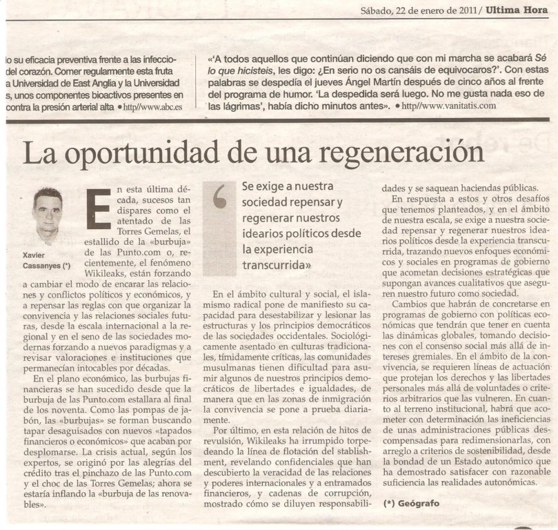 La oportunidad de una regeneración. 22 enero, 201123 mayo, 2011 / xaviercassanyes Compartir Email a link to a friend (Se abre en una ventana nueva) Correo electrónico Compartir en WhatsApp (Se abre en una ventana nueva) WhatsApp TweetMás Compartir en Reddit (Se abre en una ventana nueva) Reddit Compartir en TumblrPocket Compartir en Telegram (Se abre en una ventana nueva) Telegram Me gusta Cargando... Relacionado