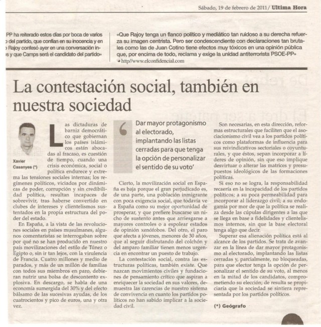 La contestación social, rebeliones en la calle. 17 mayo, 20116 junio, 2011 / xaviercassanyes En febrero publiqué este artículo que me parece a propósito de los acontecimientos de estos días. Compartir Email a link to a friend (Se abre en una ventana nueva) Correo electrónico Compartir en WhatsApp (Se abre en una ventana nueva) WhatsApp TweetMás Compartir en Reddit (Se abre en una ventana nueva) Reddit Compartir en TumblrPocket Compartir en Telegram (Se abre en una ventana nueva) Telegram Me gusta Cargando... Relacionado