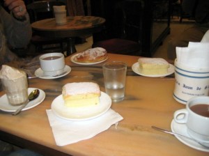 El que sorprenia d’aquell local, tan diferent, és que pareixia que estava tot un poc amuntegat, però les taules de ferro i marbre desgastat pel temps d’ús, rectangulars i algunes rodones, tenien aquell aire d’austeritat benestant que evocava aquells altres cafès de memòria, com el Mocca, el Miami (tot un standing) o aquell altre, recreat en la pel·lícula “La Colmena” de la novel·la de Cela. La il·luminació més aviat pobre, amb ampolles de poca potència, i les olors mescla de quemullars, xocolata i l’olor de les ensaïmades que es coïen en el forn de llenya que hi havia a un extrem sobre el qual lluïa el mural d’enrajolat que presideix la sucursal del carrer d’en Sanç, Ca’n Joan de S’Aigo casa fundada l’any 1700. Les parets encalades vestides d’un groguenc de l’aler dels clients, quan fumar era de distinció.