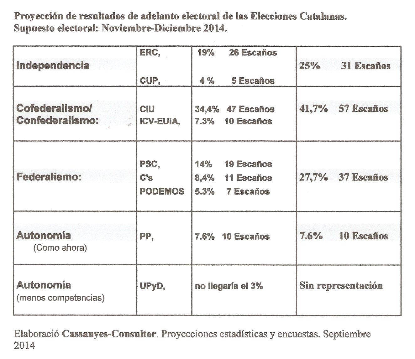 Aún así, todo indica que la Consulta no se hará, al menos del modo cómo se ha anunciado, y no se repetirá la imagen de un President entre barrotes, como en 1934.  Unas elecciones anticipadas en las que se formaran frentes de opinión, opción menos deseable, o que cada partido optara por una respuesta de Consulta, cuadraría el círculo de celebrar una Consulta legal. Tirando de especulación, y teniendo en cuenta declaraciones programáticas de los partidos, encuestas preelectorales y sobre la Consulta, y los resultados de las tres últimas elecciones, me permito un juego predictivo que tiene el valor que cada uno quiera darle.