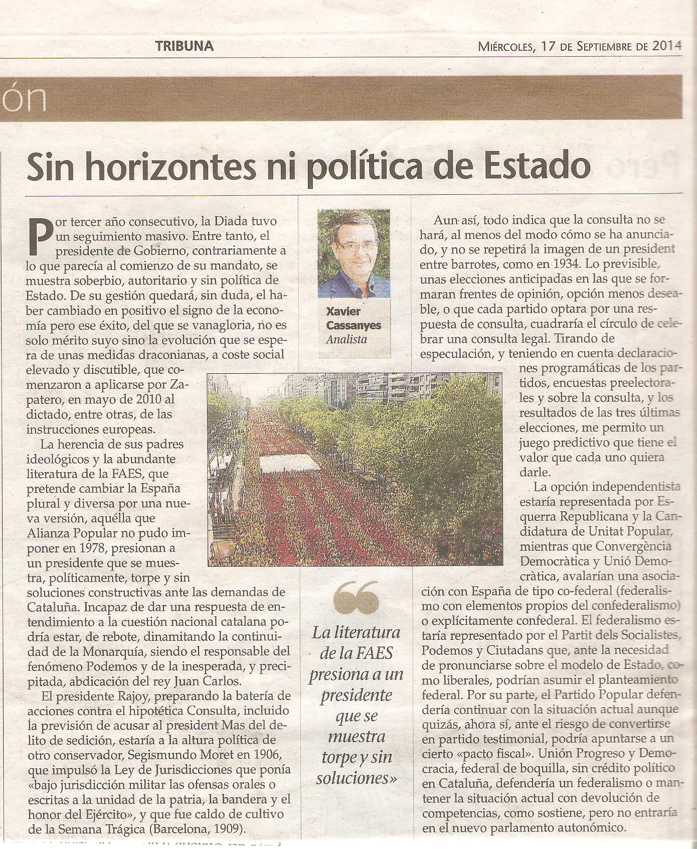 La herencia de sus padres ideológicos y la abundante literatura de FAES, que pretende cambiar la España plural y diversa por una nueva versión, aquella que Alianza Popular no pudo imponer en 1978, presionan a un Presidente que se muestra, políticamente, torpe y sin soluciones constructivas ante las demandas de Cataluña. Incapaz de dar una respuesta de entendimiento a la cuestión nacional catalana, podría estar, de rebote, dinamitando la continuidad de la Monarquía, siendo el responsable del fenómeno Podemos y de la inesperada, y precipitada, abdicación del rey Juan Carlos.