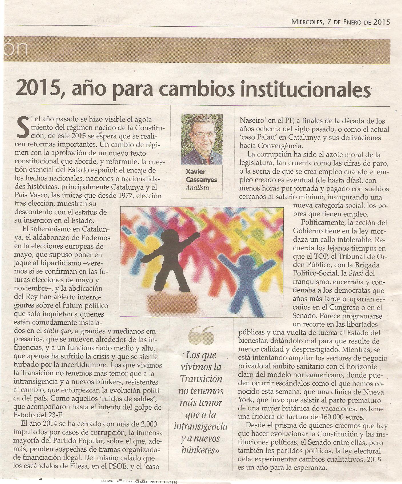 Si en el año pasado se hizo visible el agotamiento del régimen nacido de la Constitución, de este 2015 se espera que se realicen reformas importantes. Un cambio de régimen con la aprobación de un nuevo texto constitucional que aborde, y reformule, la cuestión esencial del Estado español: El encaje de los hechos nacionales, naciones o nacionalidades históricas, principalmente Cataluña y el País Vasco, las únicas que desde 1977, elección tras elección, muestran su descontento con el estatus de su inserción en el Estado.