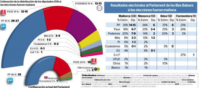 La encuesta de UH sobre las expectativas de voto en las autonómicas de mayo prevé que el PP podría conseguir 27 diputados, PSOE 15 y PODEMOS 13.