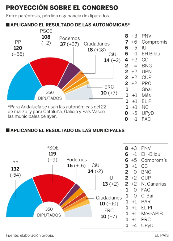 ¿Cuáles son las previsiones de cara a las generales? Si las pasadas autonómicas hubieran sido generales, ésa es la proyección que publicó ELPAIS el 25 de mayo.