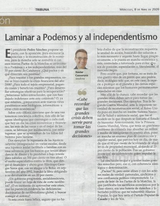 El presidente Sánchez propone un pacto, con la oposición, para encauzar la postcrisis y la reconstrucción de la economía, pero la derecha solo se avendría si con esos nuevos Pactos de la Moncloa se arrinconara a Podemos y a los independentistas, más del 55 por ciento de Catalunya. ¿Qué pactos y en qué dirección son posibles?