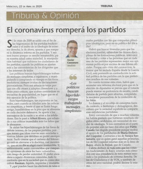 Si la crisis de 2008 se saldó con el fin de las hegemonías de los partidos tradicionales y el asalto de la ideología de extrema derecha; la de ahora, apunta a que romperá la dinámica interna en los partidos. Y eso será bueno porque ya resulta insostenible, para nuestra salud como sociedad, la manipulación habitual que sufrimos los ciudadanos de los partidos; cuando las políticas se ajustan más a las conveniencias de los dirigentes que a los intereses de todos.