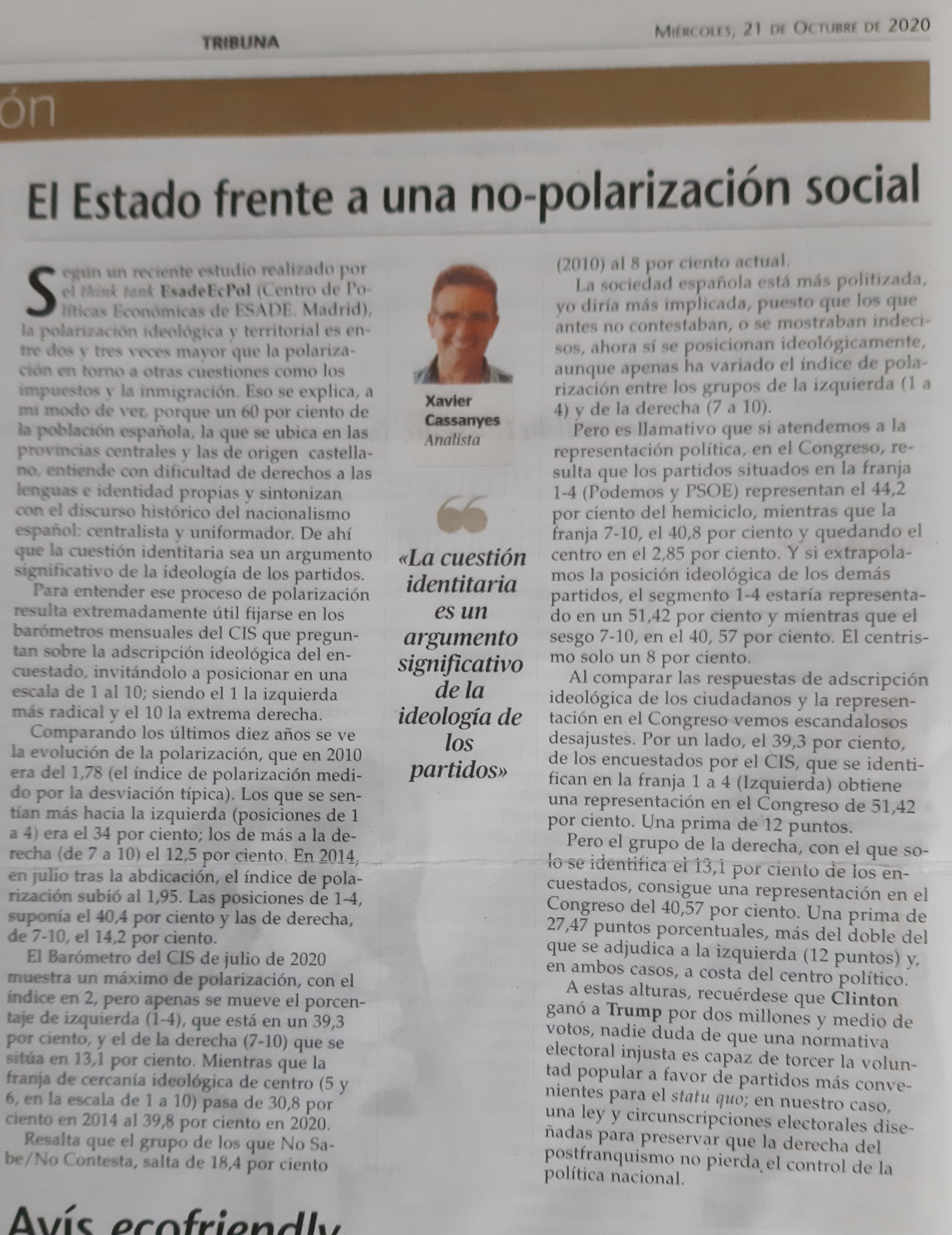 La semana pasada se publicaba el último estudio sobre la polarización política en España, realizado por el think tank EsadeEcPol (Centro de Políticas Económicas de ESADE. Madrid). El estudio constata la creciente polarización política y trata de evaluar el grado y la cualidad de esa polarización midiendo el grado de discrepancia en la sociedad en temas políticos, económicos y sociales concretos.