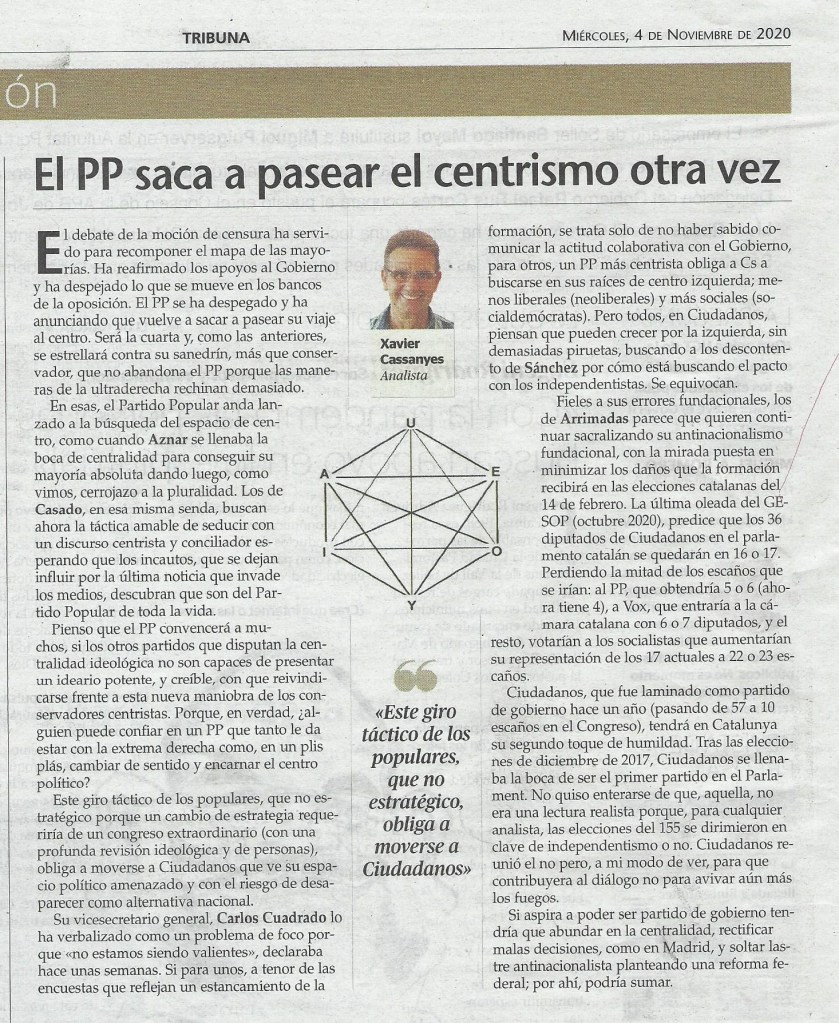 Pienso que el PP convencerá a muchos, si los otros partidos que disputan la centralidad ideológica no son capaces de presentar un ideario potente, y creíble, con que reivindicarse frente a esta nueva maniobra de los conservadores centristas. Porque, en verdad, ¿alguien puede confiar en un PP que tanto le da estar con la extrema derecha como, en un plis plás, cambiar de sentido y encarnar el centro político?