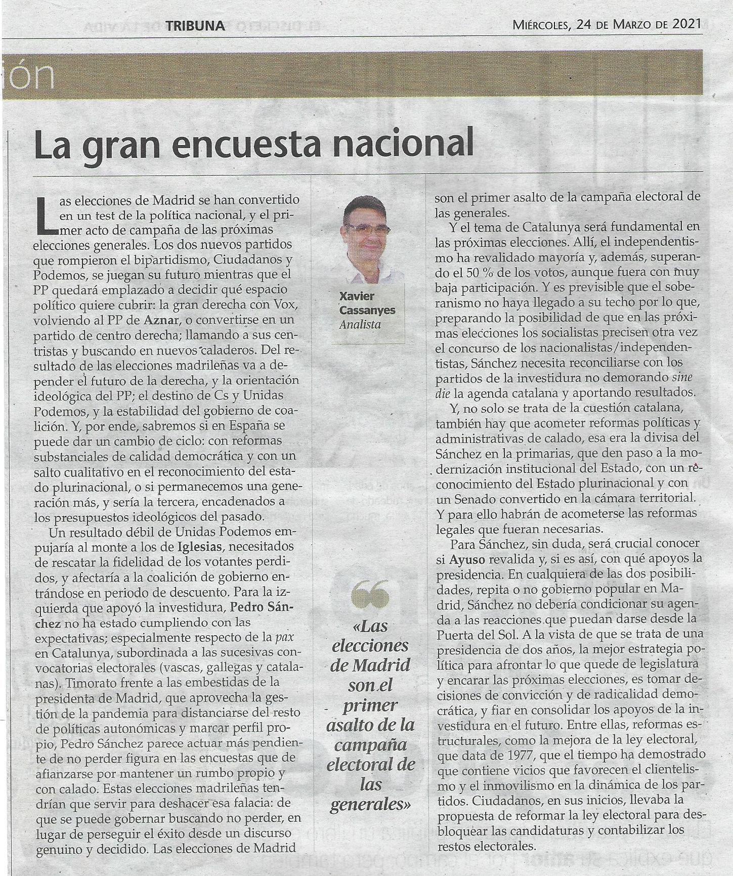 Las elecciones de Madrid se han convertido en un test de la política nacional, y el primer acto de campaña de las próximas elecciones generales. Los dos nuevos partidos que rompieron el bipartidismo, Ciudadanos y Podemos, se juegan su futuro mientras que el partido popular quedará emplazado a decidir qué espacio político quiere cubrir: la gran derecha con Vox, volviendo al PP de Aznar, o convertirse en un partido de centro derecha; llamando a sus centristas y buscando en nuevos caladeros. Del resultado de las elecciones madrileñas va a depender el futuro de la derecha, y la orientación ideológica del partido popular; el destino de Ciudadanos y Unidas Podemos, y la estabilidad del gobierno de coalición. Y, por ende, sabremos si en España se puede dar un cambio de ciclo: con reformas substanciales de calidad democrática y con un salto cualitativo en el reconocimiento del estado plurinacional, o si permanecemos una generación más, y sería la tercera, encadenados a los presupuestos ideológicos del pasado.