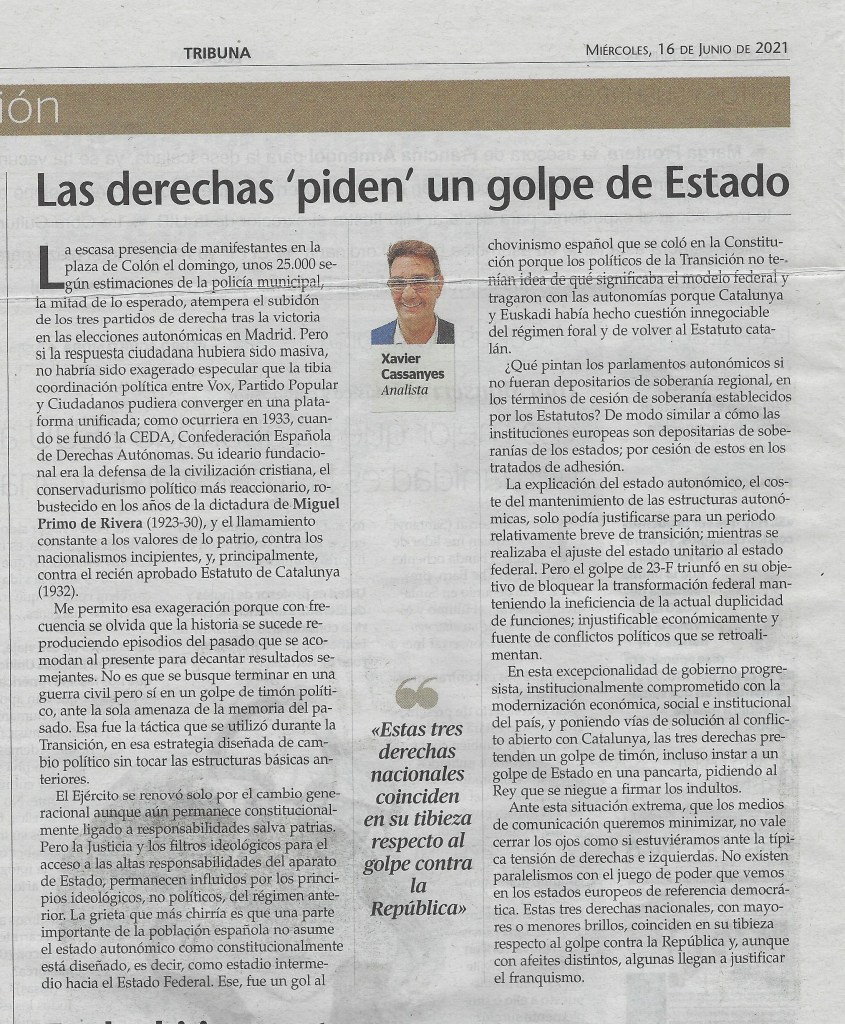 Ante esta situación extrema, que los medios de comunicación queremos minimizar, no vale cerrar los ojos como si estuviéramos ante la típica tensión de derechas e izquierdas. No existen paralelismos con el juego de poder que vemos en los estados europeos de referencia democrática. Estas tres derechas nacionales, con mayores o menores brillos, coinciden en su tibieza respecto al golpe contra la República y, aunque con afeites distintos, algunas llegan a justificar el franquismo.