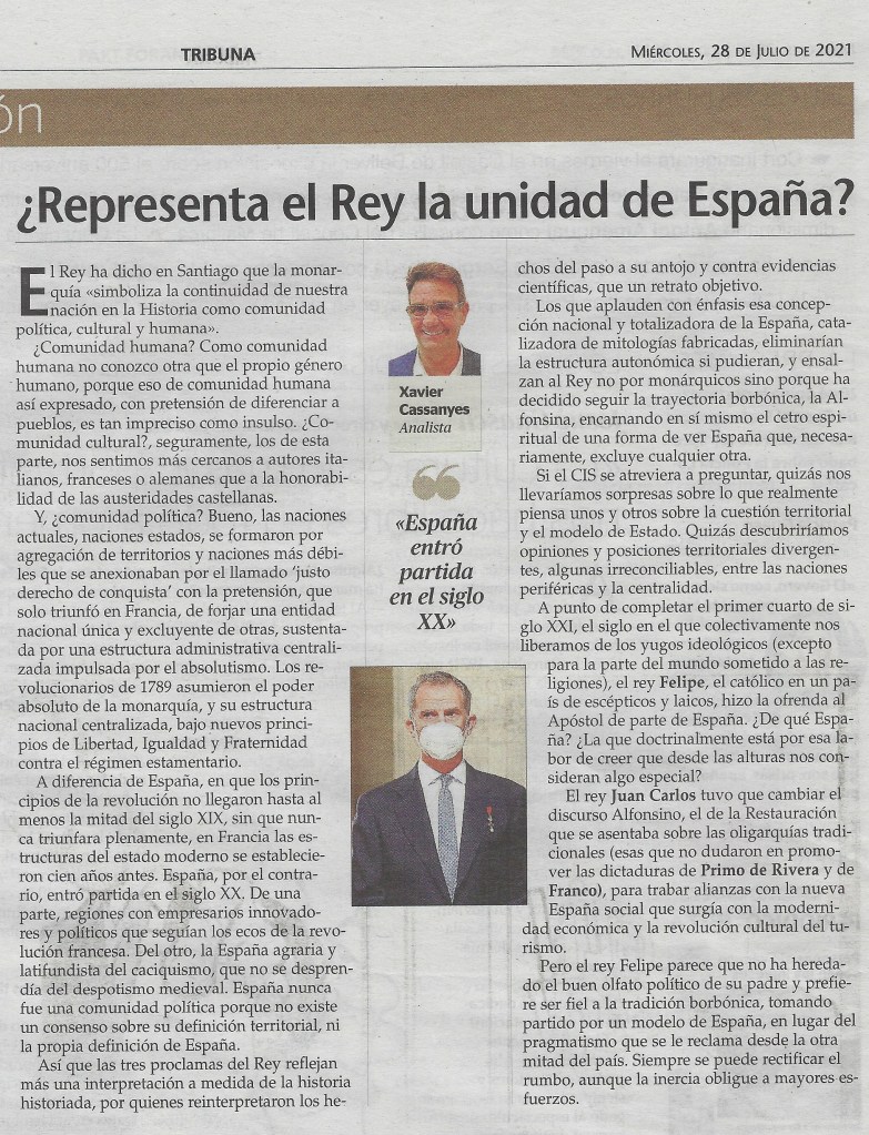 Los que aplauden con énfasis esa concepción nacional y totalizadora de la España, catalizadora de mitologías fabricadas, eliminarían la estructura autonómica si pudieran, y ensalzan al rey no por monárquicos sino porque ha decidido seguir la trayectoria borbónica, la Alfonsina, encarnando en sí mismo el cetro espiritual de una forma de ver España que, necesariamente, excluye cualquier otra.