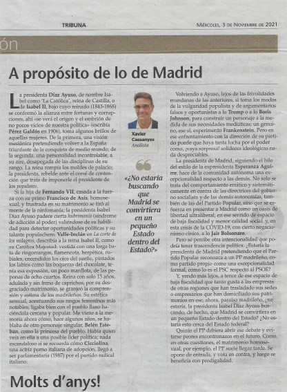 La presidenta de Madrid, siguiendo el hilo del estilo de la ex presidenta Esperanza Aguirre, hace de la Comunidad Autónoma una excepcionalidad respecto a las demás. No solo se trata del comportamiento errático y sistemáticamente en contra de las directrices del gobierno socialista y de las demás autonomías, también de las del partido popular, sino que se esfuerza en presentar a Madrid como un oasis de libertad ultraliberal; en ese sentido de espacio de baja fiscalidad y menor calidad social y, en esta crisis del Covid, con cierto negacionismo cínico, a lo Bolsonaro.