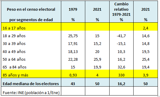 En 2021, el tramo de edad de 18 a 29 años supone el 15 por ciento de los votantes, mientras que los mayores de 85 años son el 4 por ciento. Y la edad mediana del cuerpo electoral es de 50 años; un envejecimiento que resulta especialmente preocupante no tanto por la edad física, como por la situación socioeconómica de los mayores de 65 años, jubilados, que a la hora de votar estarán más preocupados por la continuidad de su situación que por los nuevos desafíos que preocupan a los más jóvenes.