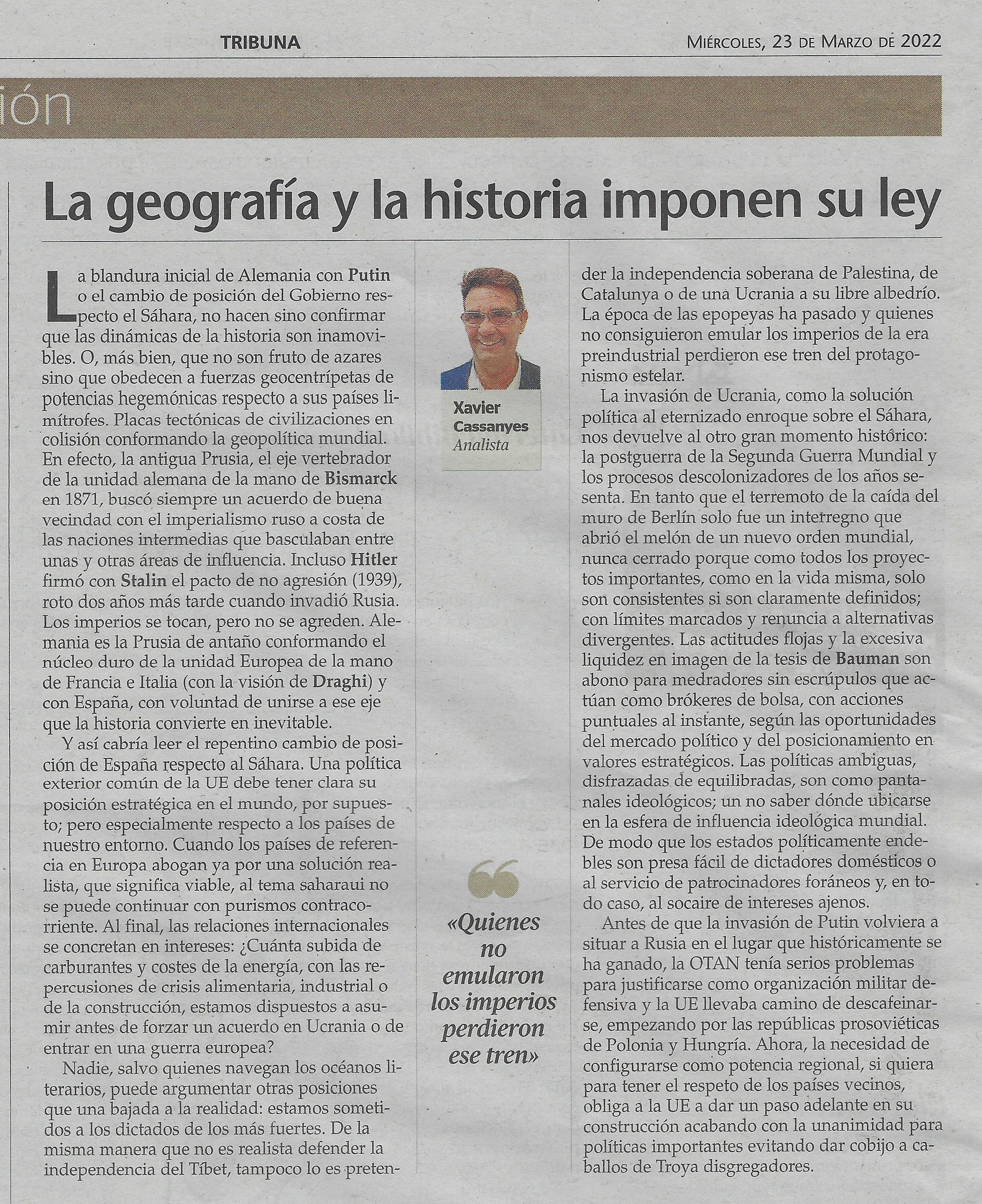 La blandura inicial de Alemania con Putin, o el cambio de posición del gobierno de España respecto el Sahara Occidental, no hacen sino confirmar que las dinámicas de la historia son inamovibles. O, más bien, que no son fruto de azares sino que obedecen a fuerzas geo centrípetas de potencias hegemónicas respecto a sus países limítrofes. Placas tectónicas de civilizaciones en colisión conformando la geopolítica mundial.