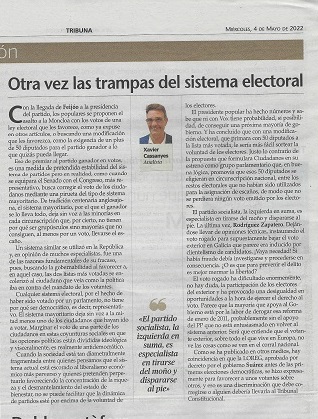 Obviamente, no participo de la opinión de que cualquier sistema electoral, por el hecho de haber sido votado por un parlamento, sea democrático, es decir, representativo. No soy partidario del sistema mayoritario que deja sin voz a la mitad menos uno de los ciudadanos que hayan ido a votar. Porque es realmente antidemocrático marginar el voto de una parte de los ciudadanos y, más, en estas coyunturas sociales en que las opciones políticas están tan diametralmente divididas ideológicamente.