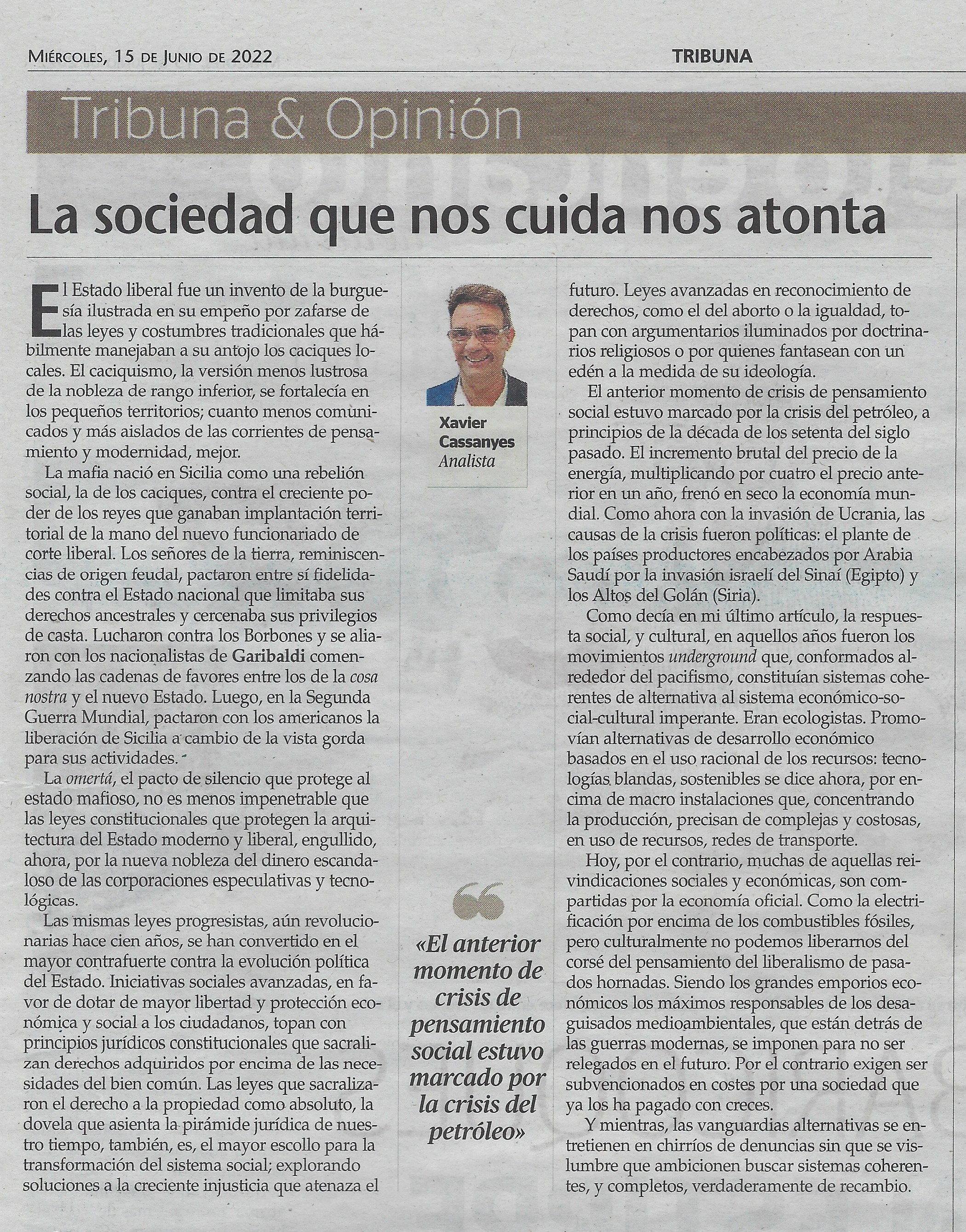 Hoy, por el contrario, muchas de aquellas reivindicaciones sociales y económicas, son compartidas por la economía oficial. Como la electrificación por encima de los combustibles fósiles, pero culturalmente no podemos liberarnos del corsé del pensamiento del liberalismo de pasados hornadas. Siendo los grandes emporios económicos los máximos responsables de los desaguisados medioambientales, que están detrás de las guerras modernas, se imponen para no ser relegados en el futuro. Por el contario exigen ser subvencionados en costes por una sociedad que ya los ha pagado con creces.