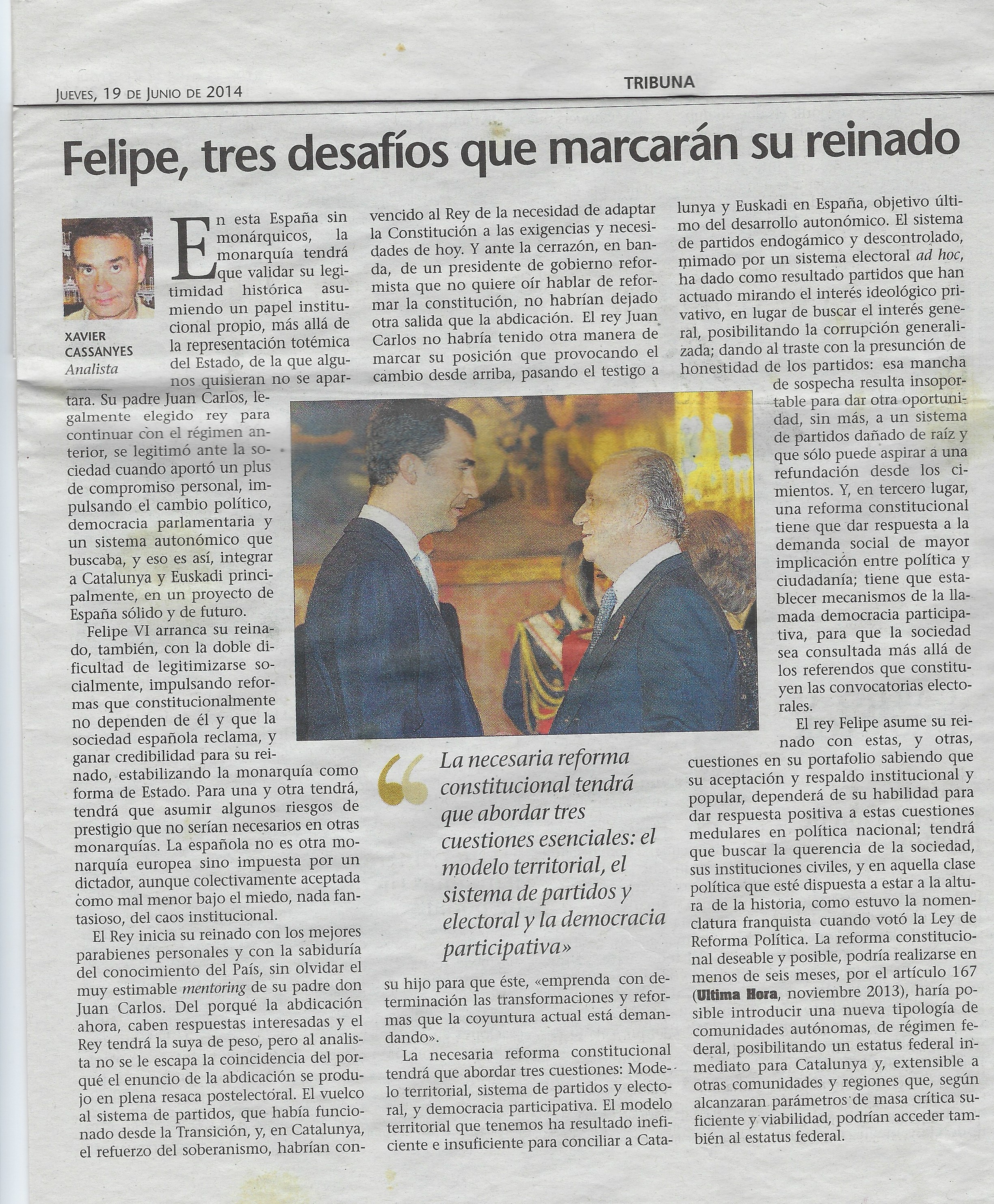 El día de la proclamación del rey Felipe VI publique en Última Hora el artículo que transcribo.