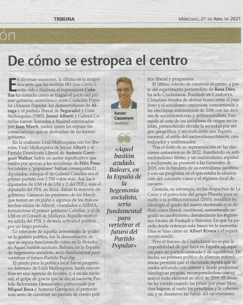 En la coalición Unió Mallorquina, Jeroni Albertí había concurrido a las elecciones con el Partido Demócrata Liberal de Antonio Garrigues Walker, en el que había un sector no mayoritario pero sí significativo que estaba por apoyar a los socialistas de Félix Pons que habían conseguido 21 diputados como Cañellas, aunque con 2700 votos menos. Así, los 6 diputados de UM (4 de UM y 2 del PDL), más el diputado del PDL en Ibiza, daban la mayoría de gobierno. Ganaron las presiones de los March que tenían en un puño a algunos de los más estrechos socios de Albertí, vinculados a ASIMA, formándose el primer gobierno Cañellas, y el de UM en el Consell de Mallorca. Aquello motivó mi salida del PDL y de toda actividad política por un largo periodo.