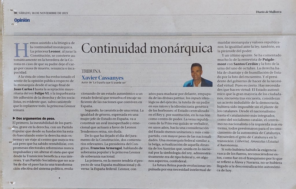 A la vista de cómo ha evolucionado, desde el aciago final de Juan Carlos I hasta la aceptación mayoritaria del rey Felipe VI, el sentir de la opinión pública respecto la monarquía y la inquebrantable adhesión de la derecha y de los socialistas, es evidente que salvo catástrofe, que lo replante todo, la princesa Leonor reinará.