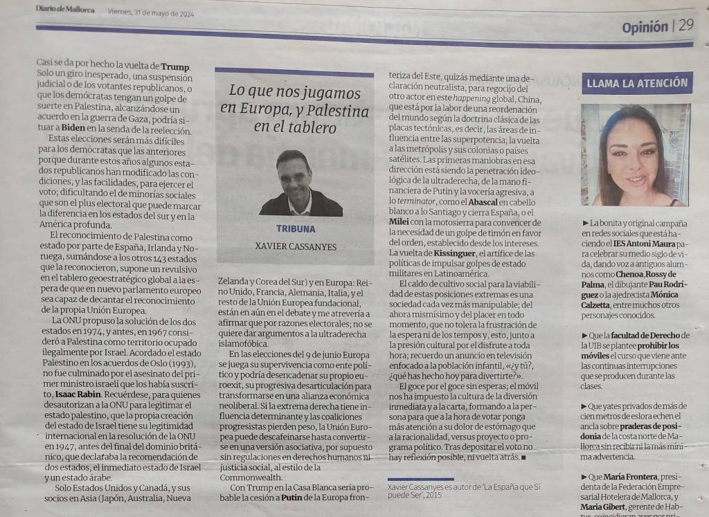 El reconocimiento de Palestina como estado por parte de España, Irlanda y Noruega, sumándose a los otros 143 estados que la reconocieron supone un nuevo ingrediente en el tablero geoestratégico global con la esperanza que este paso adelante, del tercer estado con mayor influencia en la Unión Europa, sea capaz de decantar el reconocimiento de la propia Unión Europea que se debate entre una decisión definitiva, de calado, tomando posición ante la arbitrariedad del gobierno de extrema derecha de Israel, y el miedo a tensar las relaciones frente a Estados Unidos.