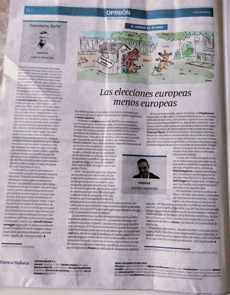 Con las elecciones europeas se cierra los liderazgos que procedieron al descalabro económico y moral de Catalunya. Puigdemont y, sobretodo Oriol Junqueras, el gran prestidigitador, recuérdese sus arengas y la crónica de cómo fue la DUI, que cuenta Xevi Xirgo en “Puigdemont, m’explico”, y que concuerda con la memoria de los periódicos de aquellos días.