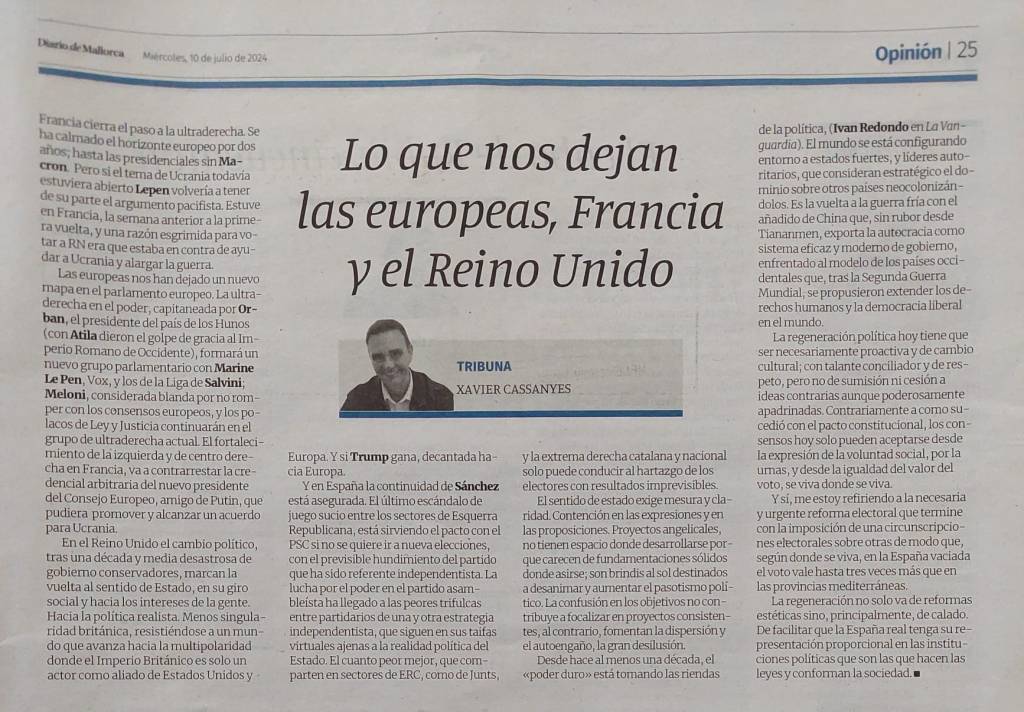 En Francia se ha cerrado el paso a la ultraderecha para que no alcanzara la mayoría absoluta en la Asamblea Nacional. La coalición de izquierda ha ganado en la segunda vuelta y el partido del presidente francés recupera oxígeno situándose en segunda lugar mientras el Reagrupamiento Nacional de Marine Lepen ha quedado en tercer lugar. Se ha calmado el horizonte europeo por dos años; hasta las presidenciales sin Macron. No se vislumbra quien pueda capitanear el centrismo republicano pero si el tema de Ucrania todavía estuviera abierto Lepen tendría, otra vez, el argumento pacifista. Estuve en Francia, la semana anterior a la primera vuelta, y una razón esgrimida para votar a RN era que estaba en contra de ayudar a Ucrania; como los de Podemos, opinando que ayudar a Ucrania era apostar por alargar la guerra.