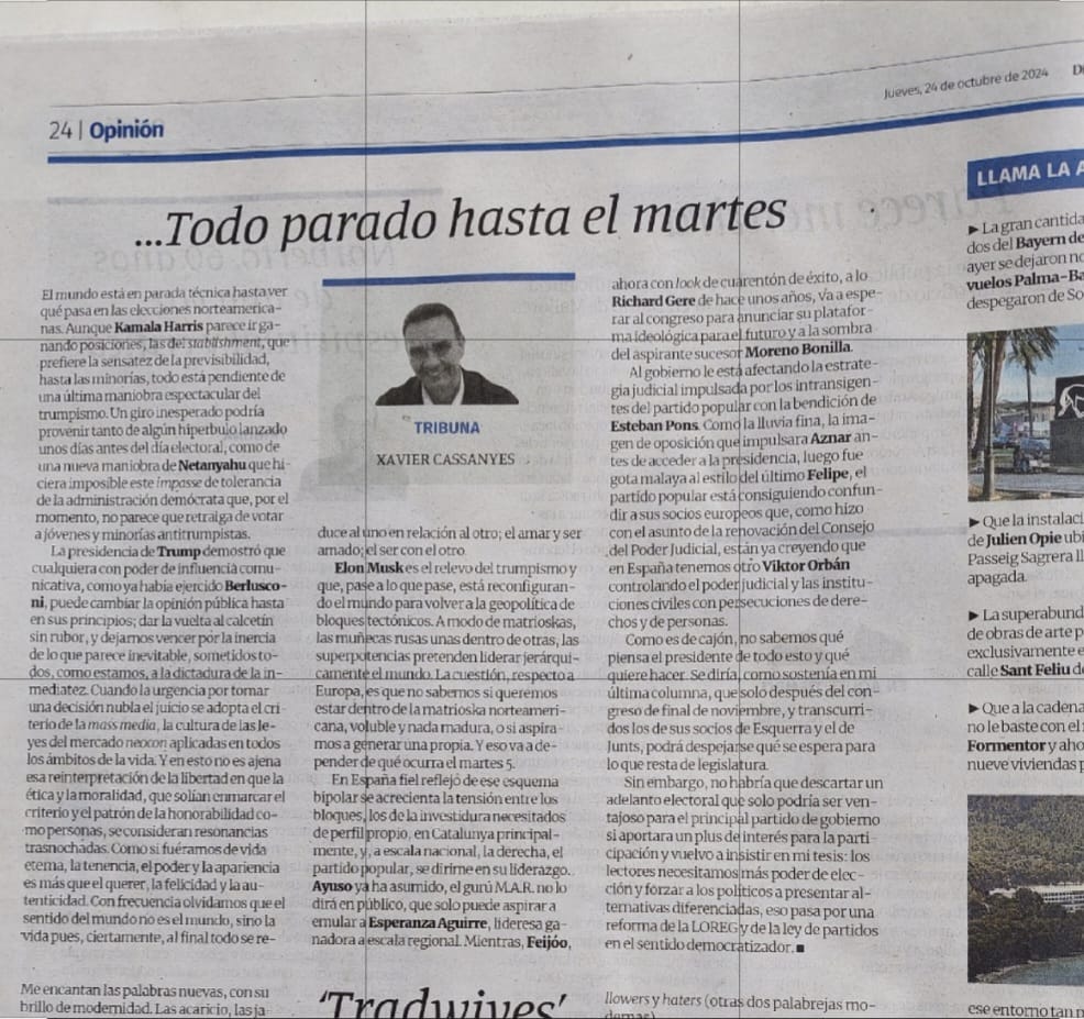 Elon Musk es el tapado, ya no tanto, que está tomando el relevo del trumpismo y que, pase a lo que pase, esta reconfigurando el mundo para volver a la geopolítica de bloques tectónicos, es decir, bloques en escala en que a modo de matrioskas, las muñecas rusas unas dentro de otras, las súper potencias pretenden liderar jerárquicamente el mundo. La cuestión, respecto a Europa, es que no sabemos si queremos estar dentro de la matrioska norteamericana o si aspiramos a generar una propia. Y eso va a depender de qué ocurra el martes 5. Si Trump accede a la presidencia iremos hacia una refundación y unificación de los fascismos. Si no, entonces, la búsqueda de las formulas nacionales continuará hasta encontrar la tecla que consiga la hegemonía política suficiente para una transición del modelo social, el nuestro, hacia ahondar y evolucionar desde la filosofía política de la ilustración o hacia una nueva era de pragmatismo que nos aboquen a distropías, no hace mucho, imposibles.
