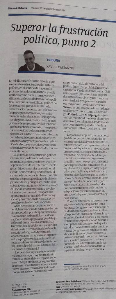 La cuestión es que de ceder al sistema autoritario, no hay alternativa intermedia, supondría entregar el poder, en un cheque crediticio, sin garantías de retorno a la situación anterior si ese nuevo sistema fracasa. Pasar de la democratiza al sistema autoritario de rango dictatorial, a la dictadura del partido único, por prohibición o expresa persecución de los demás, es tan fácil como que en unas elecciones los partidos antisistema obtengan la mayoría y cambien las leyes, para evitar perder esa mayoría en próximas elecciones. Trump es una incógnita de hasta donde un líder de 78 años, como sus homólogos Putin de 72 y Xi Jinping de 71 (estos han modificado las leyes electorales a su favor), ven el mundo desde nostalgias de grandezas pasadas o desde la humanidad, el bien común en su conjunto.