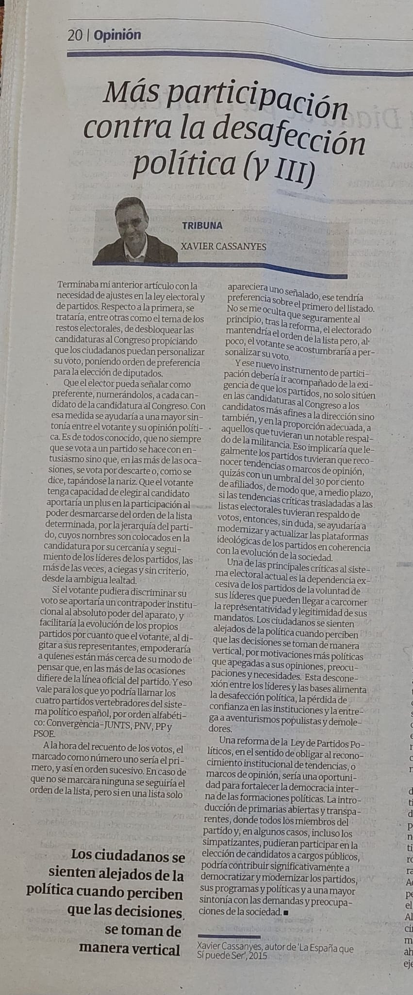 Y ese nuevo instrumento de participación debería ir acompañado de la exigencia de que los partidos, no solo sitúen en las candidaturas al Congreso a los candidatos más afines a la dirección sino también, y en la proporción adecuada, a aquellos que tuvieran un notable respaldo de la militancia. Eso implicaría que legalmente los partidos tuvieran que reconocer tendencias o marcos de opinión, quizás con un umbral del 30 por ciento de afiliados, de modo que, a medio plazo, si las tendencias críticas trasladadas a las listas electorales tuvieran respaldo de votos, entonces, sin duda, se ayudaría a modernizar y actualizar las plataformas ideológicas de los partidos en coherencia con la evolución de la sociedad.