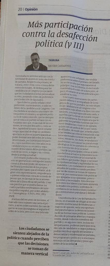 Si el votante pudiera discriminar su voto se aportaría un contrapoder institucional al absoluto poder del aparato, y facilitaría la evolución de los propios partidos por cuanto que el votante, al digitar a sus representantes, empoderaría a quienes están más cerca de su modo de pensar que, en las más de las ocasiones difiere de la línea oficial del partido. Y eso vale para los que yo podría llamar los cuatro partidos vertebradores del sistema político español, por orden alfabético: Convergència-JUNTS, PNV, PP y PSOE.