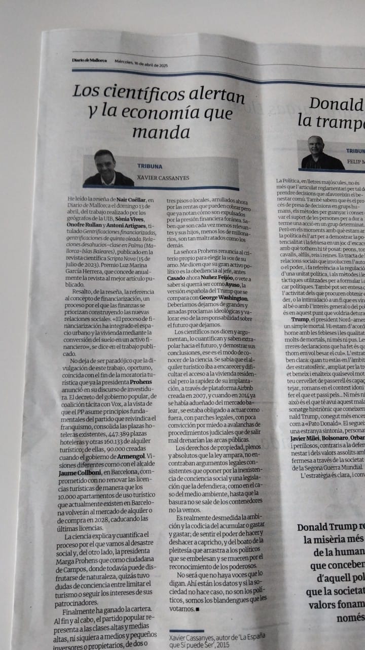 He leído la reseña de Nair Cuéllar, en DM el domingo 13 de abril, del trabajo realizado por los geógrafos de la UIB, Sònia Vives, Onofre Rullan y Antoni Artigues, titulado “Gentrificaciones financiarizadas, gentrificaciones de quinta oleada. Relaciones desahucios-clase en Palma (Mallorca-Islas Baleares)”, publicado en la revista científica Scripta Nova (15 de julio de 2023). Premio Luz Marina García Herrera, que concede anualmente la revista al mejor artículo publicado.
