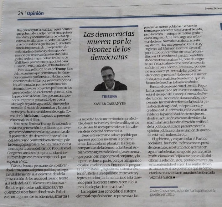 En España, el sistema electoral sobre-representa a las provincias menos pobladas. Lo hace de forma especialmente notoria en el Senado, pero también en el Congreso. Ante esto, urge una reforma electoral. No mañana: ahora, en esta legislatura. Hay margen en la LOREG (Ley Orgánica del Régimen Electoral General) pueden introducirse cambios significativos sin tocar la Constitución. Y el actual gobierno tiene la mayoría suficiente para hacerlo. Entonces, ¿por qué no se acomete ya, antes de las próximas elecciones generales? Una reforma profunda no el maquillaje que se está preparando.