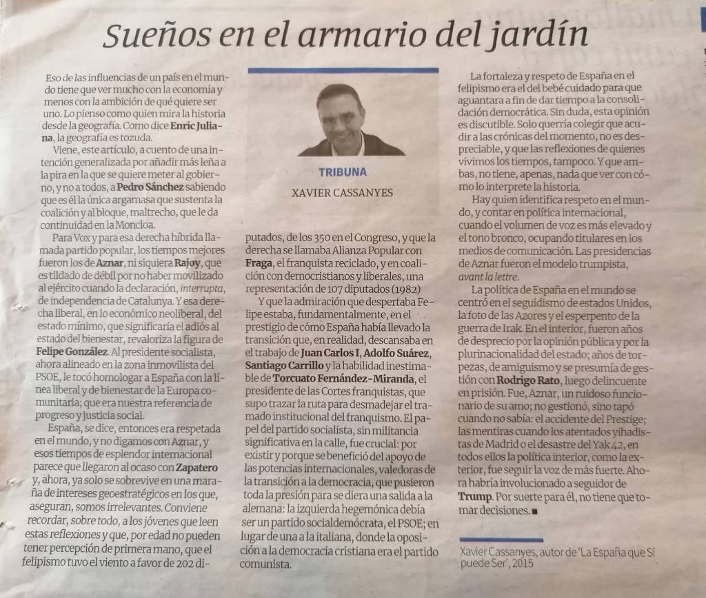 Para Vox y esa derecha híbrida llamada partido popular, los tiempos mejores fueron los de Aznar, ni siquiera Rajoy que es tildado de débil por no haber movilizado al ejército cuando la declaración, interrupta, de independencia de Catalunya. Y esa derecha liberal, en lo económico neoliberal, del estado mínimo, que significaría el adiós al estado del bienestar, revalora la figura de Felipe González. Al presidente socialista, ahora alineado en la zona inmovilista del partido socialista, le tocó homologar a España con la línea liberal y de bienestar de la Europa comunitaria; que era nuestra referencia de progreso y justicia social.