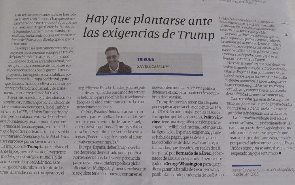 Trump desprecia y amenaza a España por esquivar aportar el 5 por ciento del PIB a la OTAN. En horas bajas, por las casos de corrupción que le han brotado, Pedro Sánchez tiene una magnífica ocasión para recuperar credibilidad interna. Defendiendo la dignidad de España y exigiendo, ya que se habla de pagar, que se devuelvan los 12.000 billones de dólares al cambio y actualizados, que llevados, en reales de a 8 (de plata) por Bernardo de Gálvez, gobernador de Lousiana española, fueron entregados a George Whasintong para que pudiera ganar la batalla de Georgetown, y posibilitaar la independencia de los Estados Unidos de Norteamérica. El propio presidente Whasintong, y está documentado, afirmó que sin la ayuda española la independencia no habría sido posible.