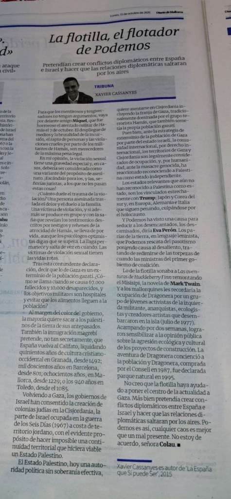 No creo que la flotilla haya ayudado a poner el centro de la actualidad a Gaza. Más bien pretendía crear conflictos diplomáticos entre España e Israel y hacer que las relaciones diplomáticas saltaran por los aires. Podemos es así, cualquier caos es mejor que un mal presente. No estoy de acuerdo, señora Colau.