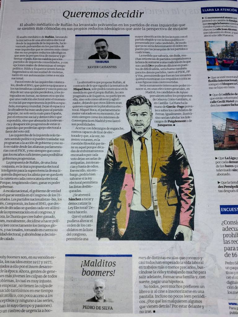 El asalto mediático de Rufián, lanzando la iniciativa de una alterativa electoral desde la izquierda de la izquierda, ha levantado polvaredas en los partidos de esas izquierdas que se sienten más cómodas en sus propios reductos ideológicos que ante la perspectiva de mojarse y gobernar el país. Eso no valdría para los partidos de izquierda consolidados, y con opciones reales de determinar el tempo político. Bildu y Esquerra tienen fuerza hegemónica sin necesidad de muletas, tanto en sus autonomías como a escala nacional.