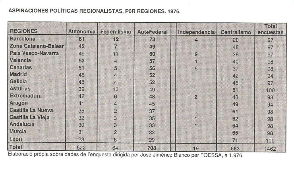 El cuadro que sigue, refleja las preferencias de la población española en el tema autonómico en 1.976, según una encuesta realizada por la fundación FOESSA