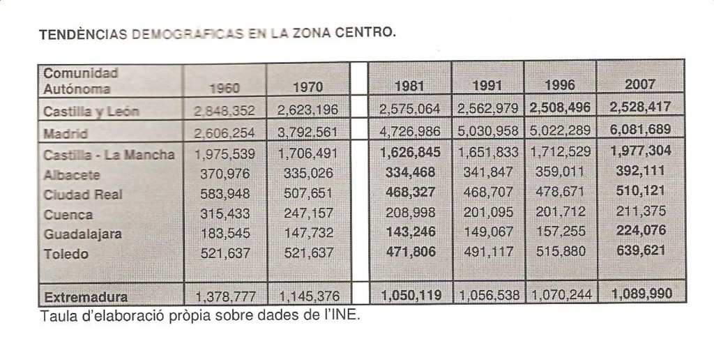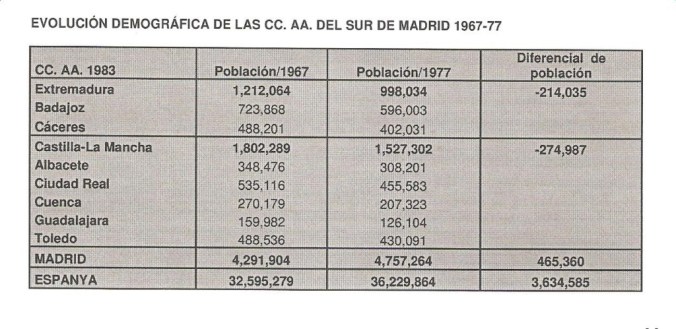 El cuadro que sigue visualiza este desequilibrio se describe cómo las dos regiones del sur de Madrid estaban perdiendo población en ratios escandalosos, mientras que Madrid ganaba, casi, en la misma magnitud.