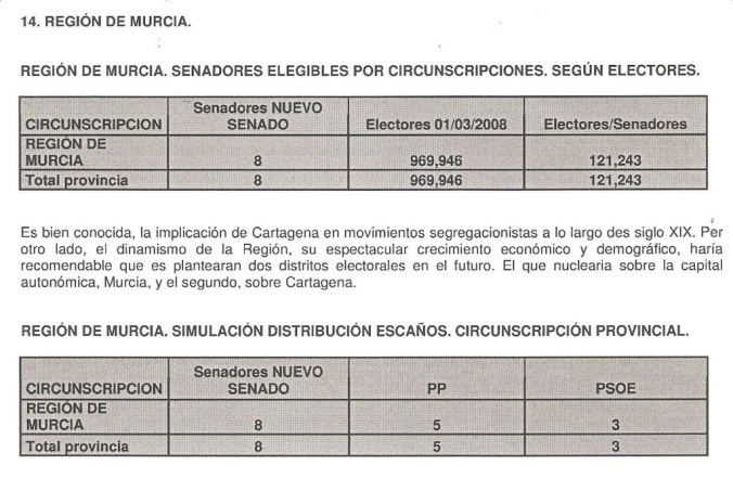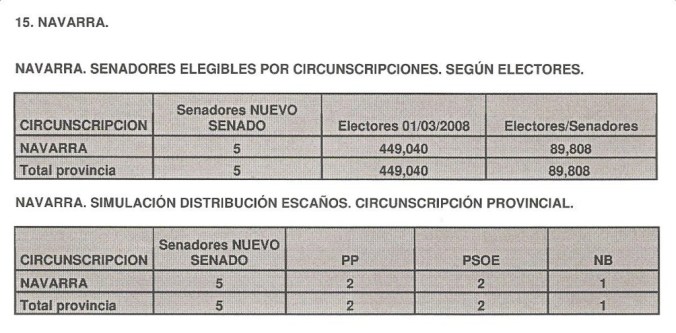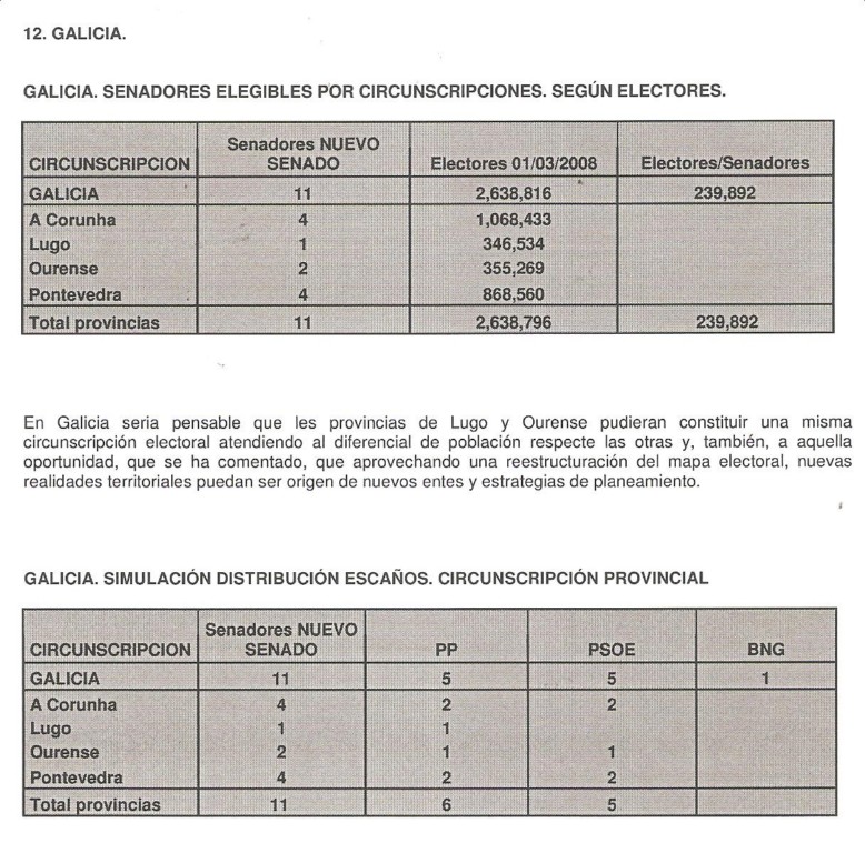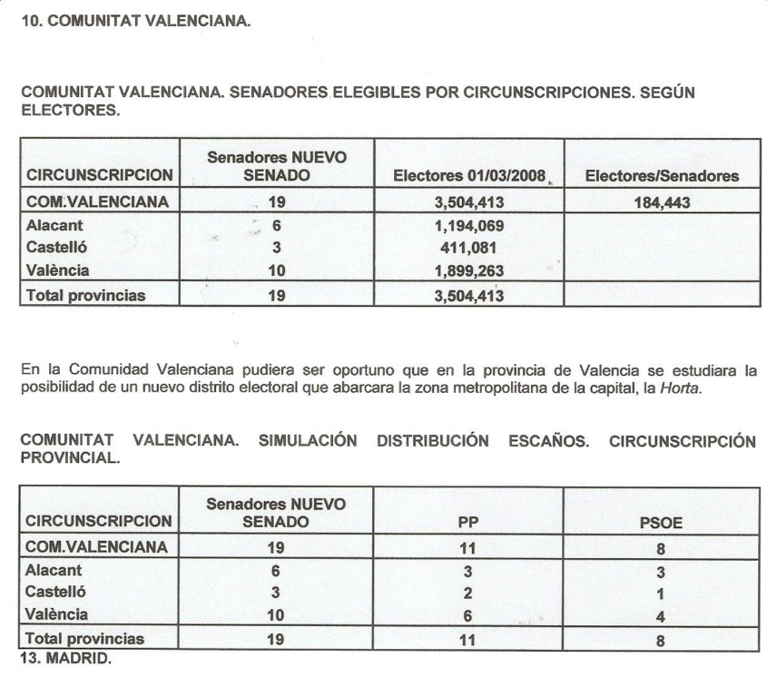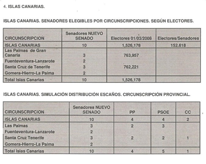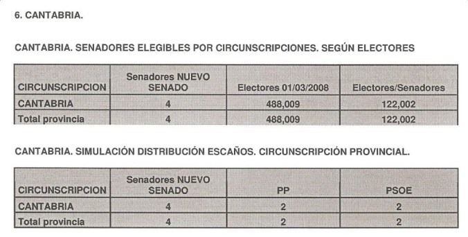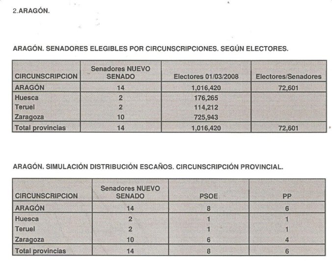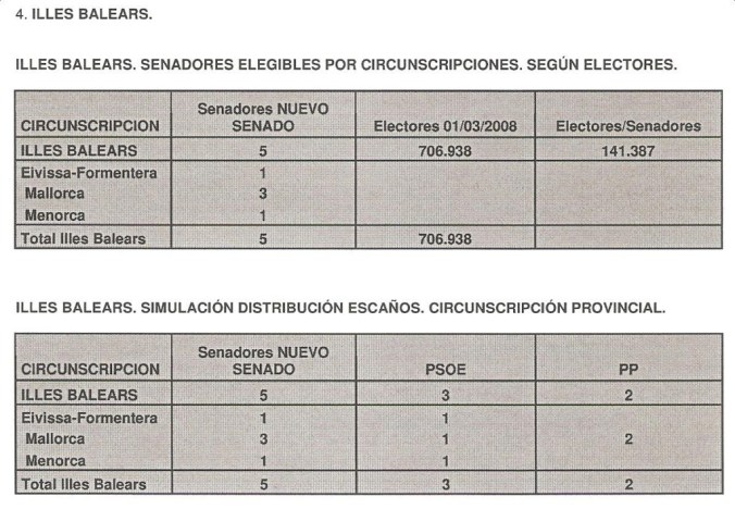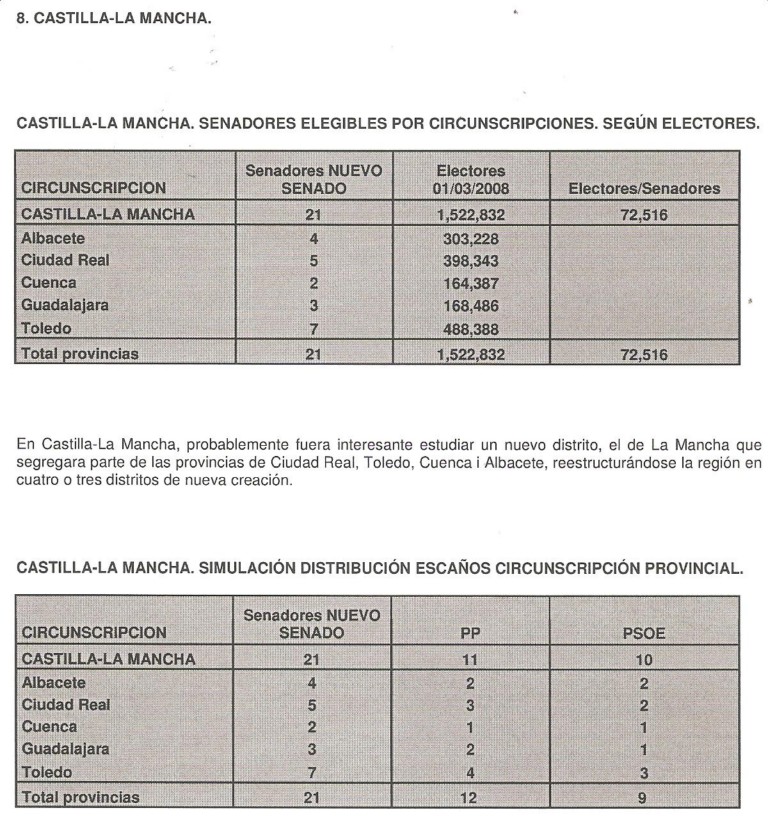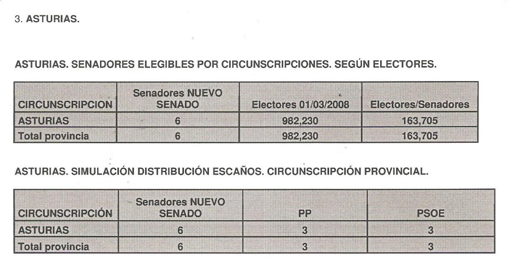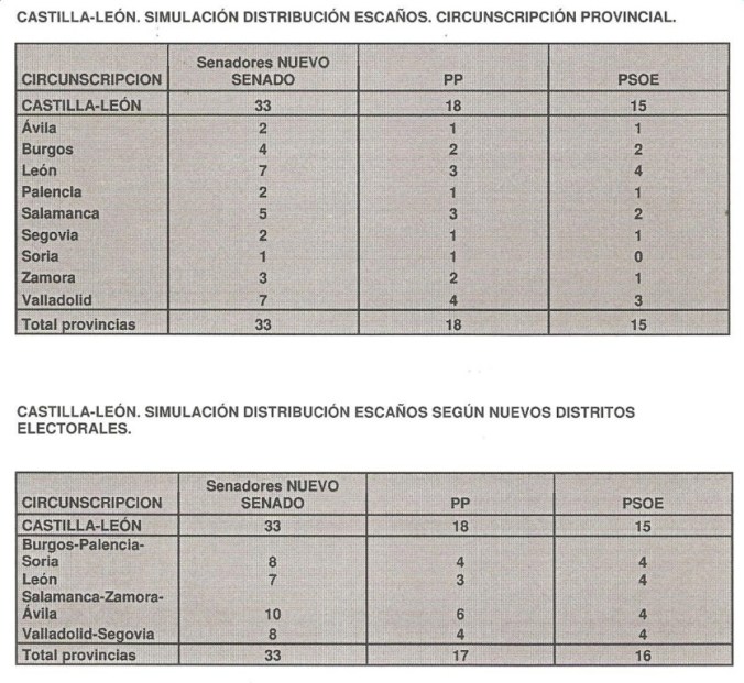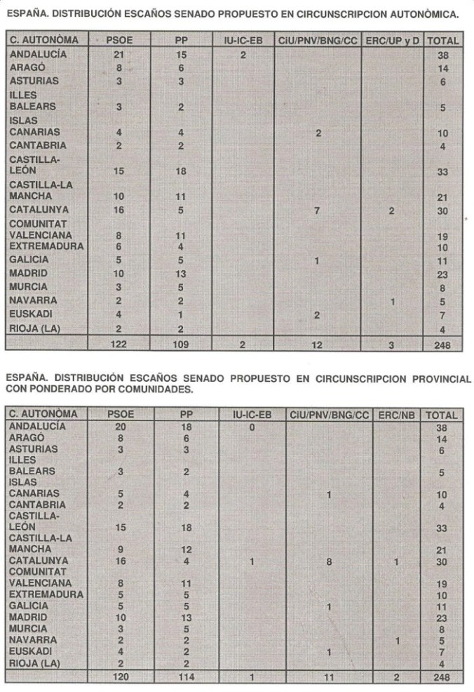 Los cuadros siguientes reflejan la asignación de Senadores por Comunidad Autónoma y las simulaciones por circunscripciones según sea única, para todala ComunidadAutónoma o por distritos electorales nuevos; conformados conservando la demarcación provincial o nuevas agrupaciones territoriales.