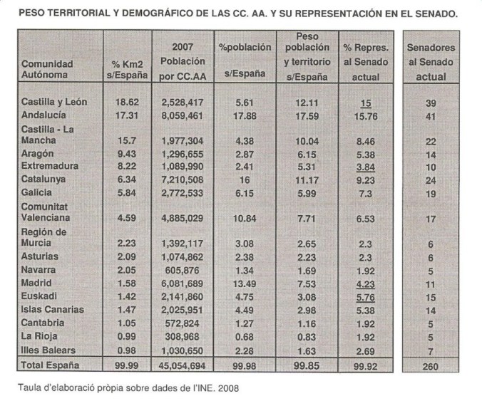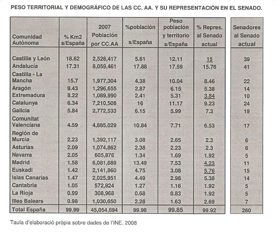 Esta asimetría se contempla tanto desde el punto de vista de la extensión, la superficie, como por lo que se refiere a la población, que habría de sentirse reflejada en la cámara de representación territorial. El cuadro siguiente, que ya se ha reproducido en páginas anteriores, recuerda las incongruencias de representatividad del Senado en su composición actual.