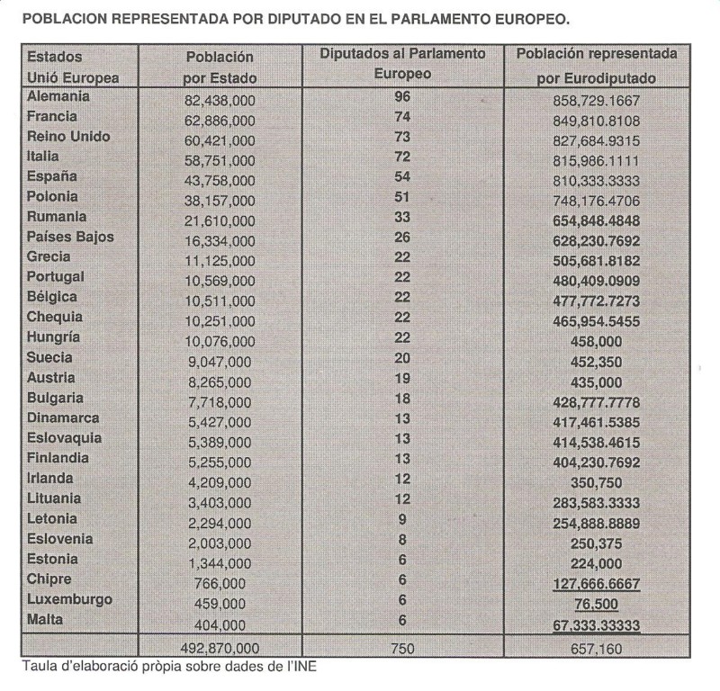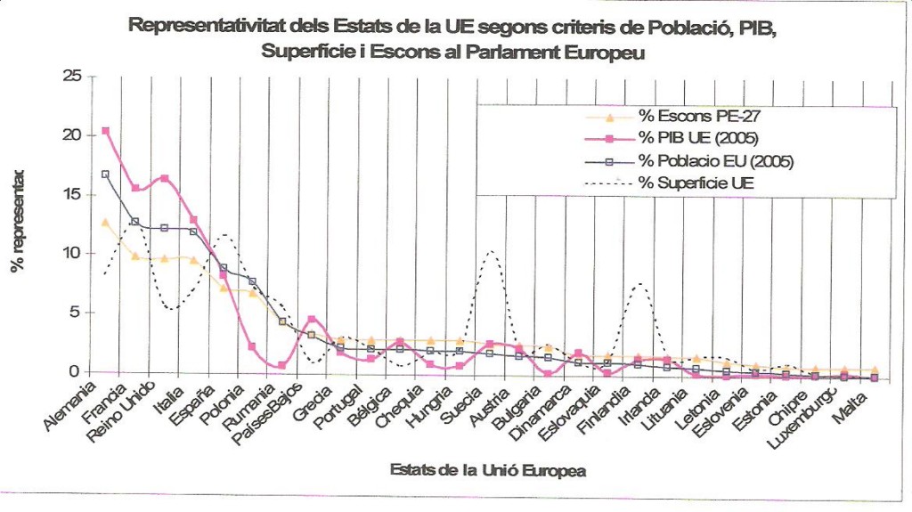 En primer lugar, un grupo de estados más poblados y desarrollados, cuyo índice de representatividad estaría entre un, razonable, (más menos) + – 30%, que van del caso de Alemania 0,765, el país peor representado (es decir, tiene un 25% menos de escaños que los que le corresponderían por su peso demográfico) y Grecia, que con un índice de 1,237, casi un 25% de sobre representatividad. Seguiría un grupo reducido de tres estados pequeños, territorial, demográfica y económicamente, que están exageradamente sobre representados: Chipre (5,147), Luxemburgo (8,59) y Malta (9,759), que podría justificarse por la necesidad de un mínimo de representación al margen de criterios objetivos. Y, finalmente, el grueso de los estados de la Unión, 15, con índices de representatividad que va desde el de Portugal (1,367) al de 2,933 de Estonia.
