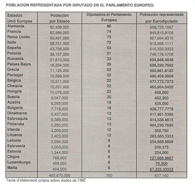El cuadro siguiente expresa en un índice esa diferencia de representatividad. El valor 1, indicaría el punto de equilibrio, mientras por debajo un déficit, es decir, que el Estado, según el criterio demográfico de comparación, le correspondería una mayor cuota de participación en el Parlamento Europeo. Cuando el valor del índice es superior a 1, calibra un exceso de representación.