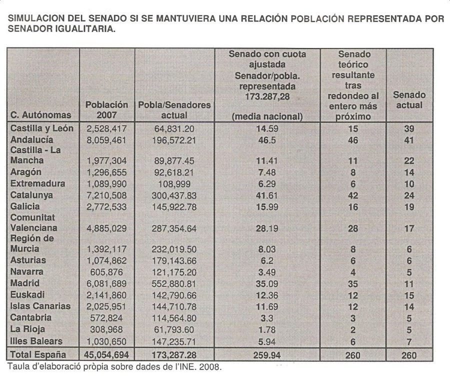 La asignación actual de Senadores por Comunidad Autónoma sería, aún, mas inadecuada si se considerara una relación igualitaria de población representada por cada Senador. El cuadro siguiente propone esta comparación.