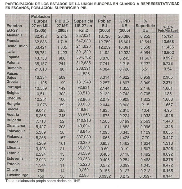 Las columnas 2, 3 y 4 muestras los datos absolutos; les 5,6 y 7 el peso relativo en porcentaje respecto el total de la Unión Europea. En la última columna se suman, en ponderación equitativa, los tres criterios y se asigna a cada estado su peso relativo.
