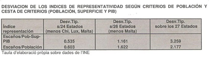 En el cuadro anterior se visualiza la desviación típica de los índices de representatividad; cociente entre representación política, escaños, y la cuota de participación según los criterios tomado en consideración. Se ha hecho el cálculo sobre los valores de 24 estados, 26 y sobre la totalidad de los 27 estados de la Unión Europea.